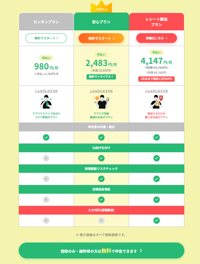 登録とスワイプまでは無料!申告書を出す段階で有料プランが必要になります。